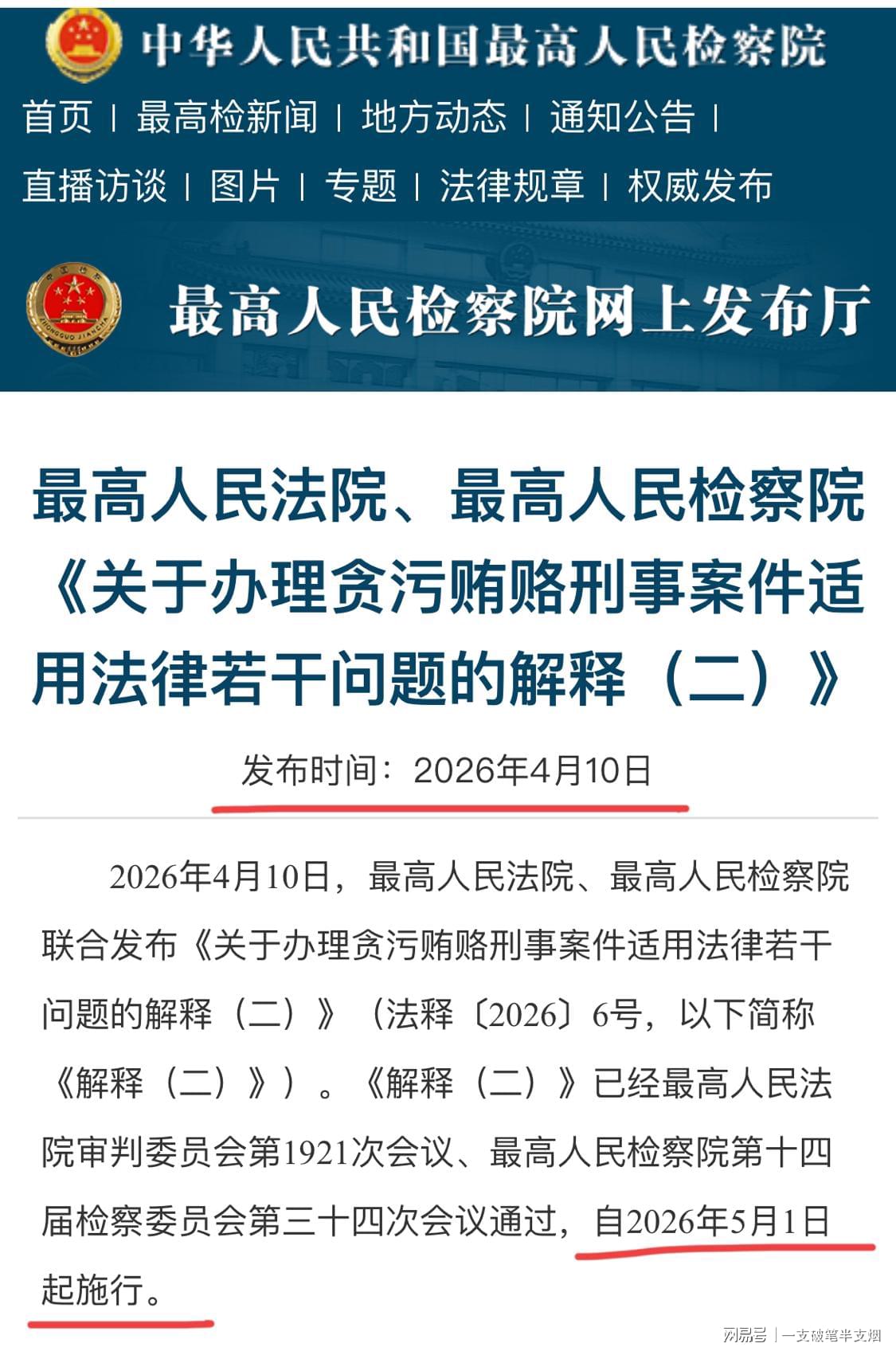 2026年4月10日,最高人民法院、最高人民检察院联合颁布《关于办理贪污贿赂刑事案件适用法律若干问题的解释(二)》。