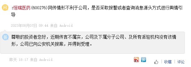 8月9日,面对投资者多次询问,恒瑞医药称已就不实传闻报警。 截图自投资者平台。