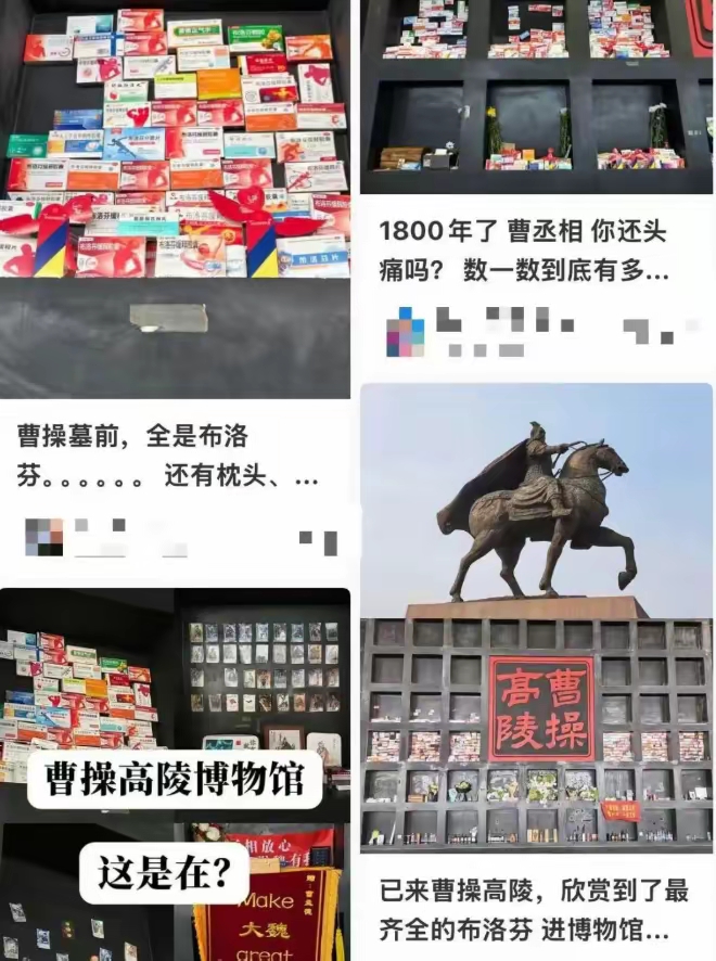 曹操高陵遗址博物馆从开馆起,也成了“布洛芬集中展示区”,品种之多令人咋舌。为何人们要用布洛芬当祭品?史书上记载,曹操患有头风,爱头疼,而且高陵也曾出土过一块刻有“魏武王常所用慰项石”的石枕,印证了他长期受头颈疼痛困扰,需要热敷颈部来缓解头痛的事实。不仅如此,粉丝也想要通过“吃布洛芬不喝酒”的方式,让曹操无需“对酒当歌”“唯有杜康”。