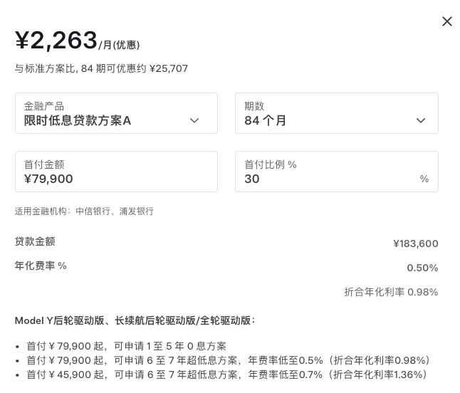 例如特斯拉的7年低息方案采用银行抵押贷款模式,年化费率最低0.5%,折合年化利率约0.98%,其最核心的特点是车辆产权自提车起就归消费者所有,可以说从源头避免了消费者遭遇“以租代购”的购车误区。
